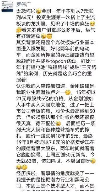 “认识我的人应该都知道,金刚玻璃是我职业生涯滑铁卢之一,15年初以21元每股共计5亿的价格,从金刚创始人手中买入大股东地位,过了一把上市公司老板的隐,股价也最高涨到了50元,但必须承认那个时候的我还是很傻很天真,德不配位。后面经历天灾人祸和各种螳臂当车式的挣扎,股价一路跌到了18年的5元,最终19年8月被迫以7.8元的价格(基金君注:差不多亏了超3亿)卖给了现在顺德背景的大股东。两年时间就看着它脱胎换骨,上周五创50元新高,今天就63啦。彷如隔世,不堪回首。