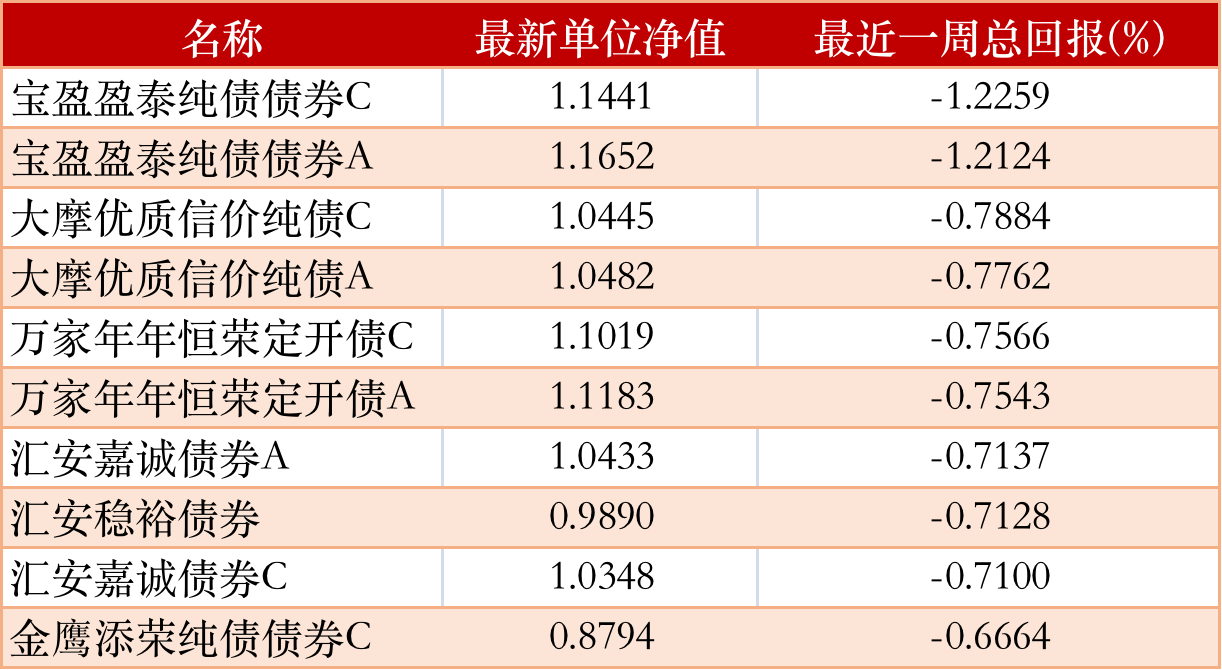 债券型基金方面,宝盈盈泰纯债债券上周跌幅最大,净值周内回撤1.23%。
