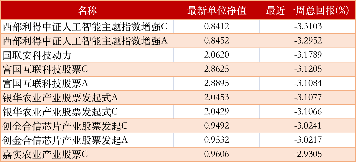 此外,上周跌幅靠前的还有银华农业产业股票发起式、创金合信芯片产业股票发起、嘉实农业产业股票等。