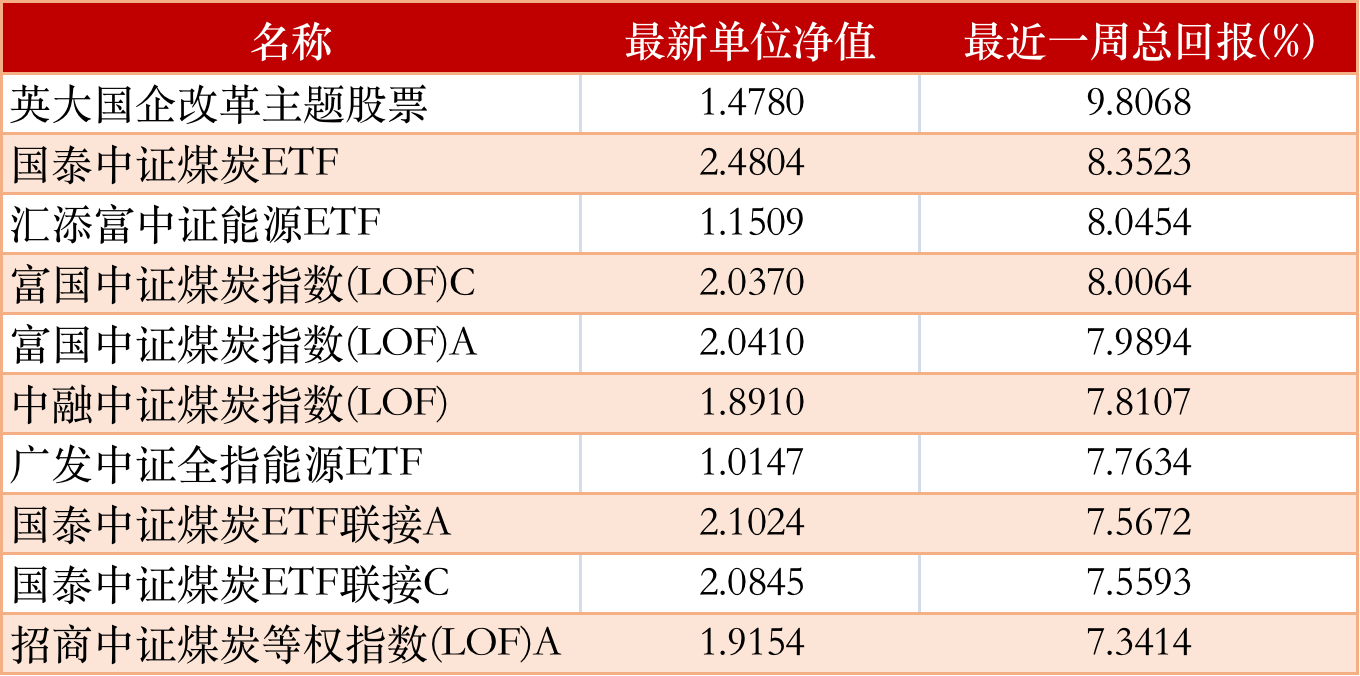 上周,国泰中证煤炭ETF居于股票型基金产品的第二位,周内净值涨超8.35%。