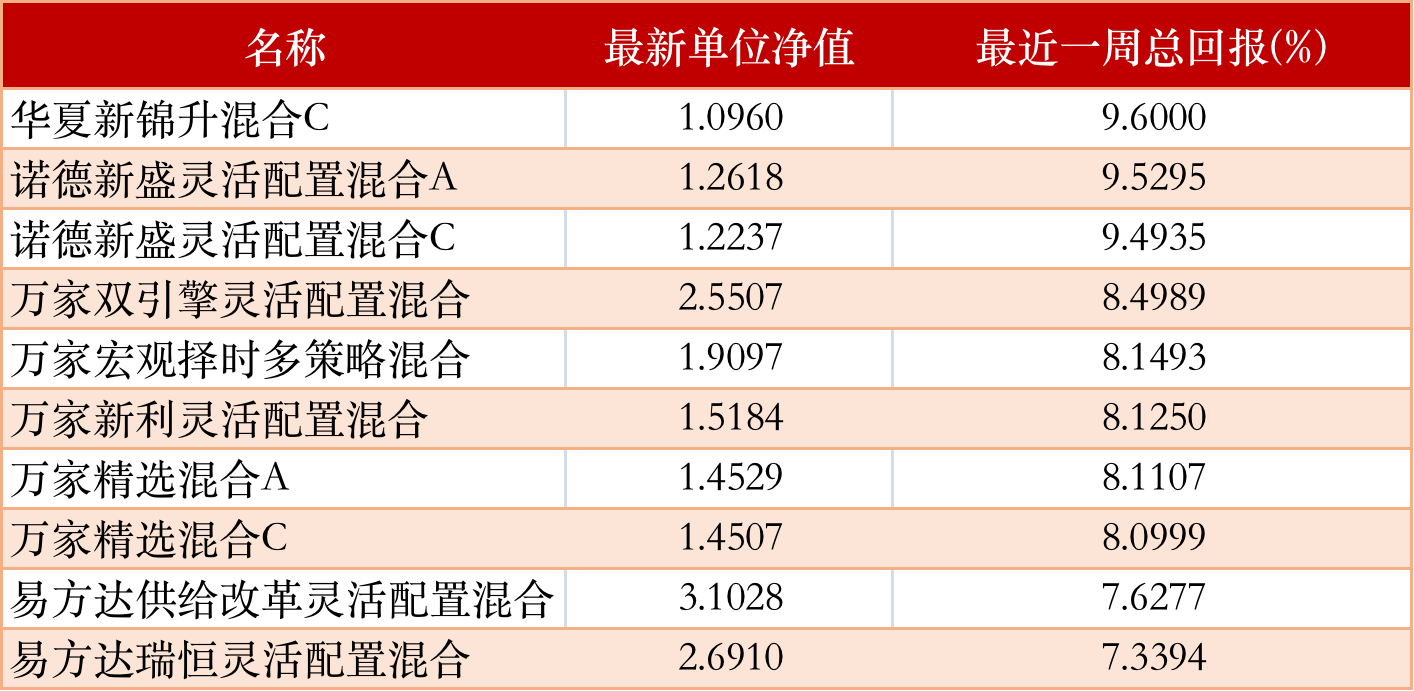 万家双引擎灵活配置混合居于混合型净值涨幅榜第三位,周内净值增长超8.4%。