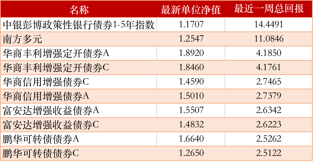 债券型基金方面,Choice数据显示,中银彭博政策性银行债券1-5年指数摘得债券基金周涨幅的冠军,涨幅14.45%。