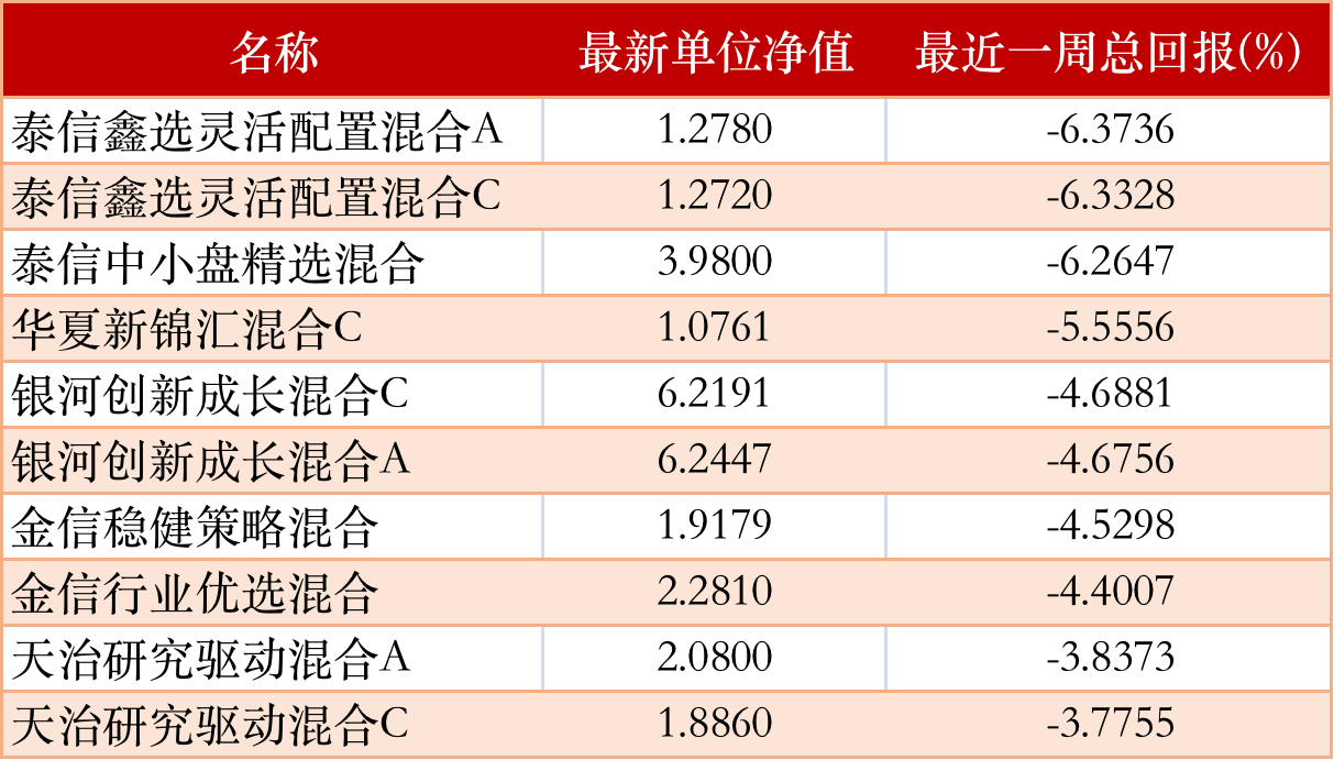 此外,上周混合型基金周净值跌幅榜的产品还有银河创新成长混合、金信稳健策略混合、金信行业优选混合等,周内产品净值下滑超过4.4%。