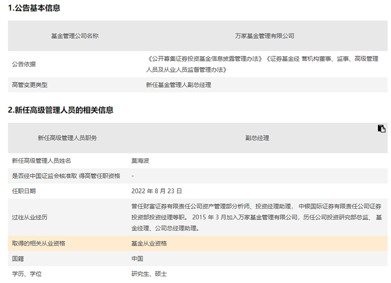 8月25日,万家基金发布公告称,自8月23日起,莫海波担任公司副总经理。梳理发现,2015年3月莫海波加入万家基金,历任公司投资研究部总监、公司总经理助理。