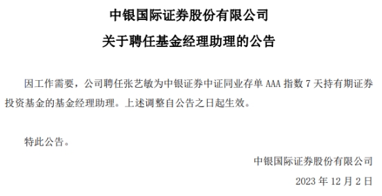 中国经济网北京12月4日讯 近日,中银国际证券股份有限公司公告称,因工作需要,公司聘任张艺敏为中银证券中证同业存单AAA指数7天持有期证券投资基金的基金经理助理。