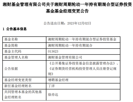 湘财周期轮动一年持有期混合增聘基金经理丁洋