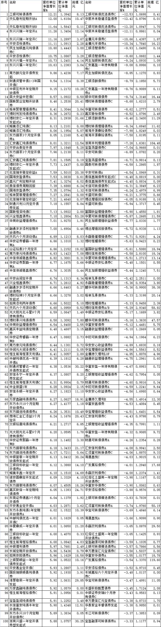 工银可转债债券基金以12.21 %位居涨幅榜首位,该基金的基金经理为黄诗原,资料显示,其2013年加入工银瑞信,先后任养老金投资中心转债高级研究员、基金经理。三季报显示,其债券和股票资产占比分别为61.75%和36.71%,前五大持仓债券为川投转债、G三峡EB1、南航转债、宏川转债、科伦转债,而重仓股票则全部为航空、电力、酒店等低估值个股。