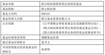 中国经济网北京12月11日讯 近日,凯石基金管理有限公司公告,凯石岐短债增聘基金经理盖书文。
