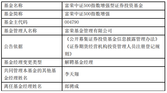 中国经济网北京12月13日讯 今日,富荣基金管理有限公司公告称,郎骋成离任富荣信息技术混合(A类013345;C类013346)、富荣中证500指数增强(A类004790;C类004791)。
