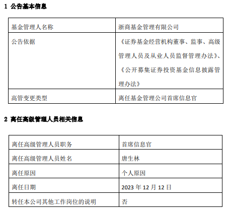 中国经济网北京12月14日讯 今日,浙商基金管理有限公司发布关于高级管理人员离任公告,首席信息官唐生林因个人原因离任。