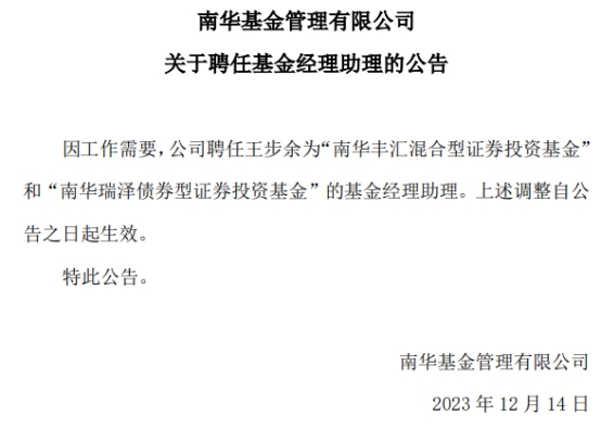 中国经济网北京12月14日讯 今日,南华基金管理有限公司发布关于聘任基金经理助理的公告。公告称,因工作需要,公司聘任王步余为“南华丰汇混合型证券投资基金”和“南华瑞泽债券型证券投资基金”的基金经理助理。