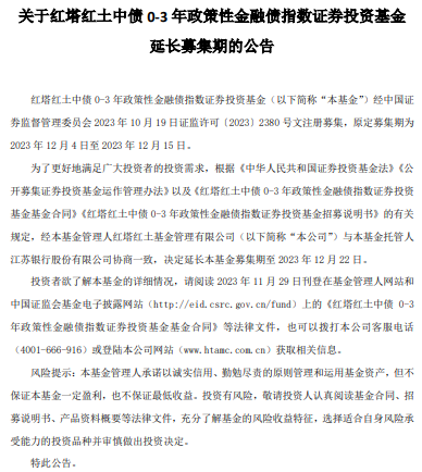中国经济网北京12月15日讯 今日,红塔红土基金管理有限公司发布关于红塔红土中债0-3年政策性金融债指数证券投资基金延长募集期的公告,原定募集期为2023年12月4日至2023年12月15日,现决定延长募集期至2023年12月22日。