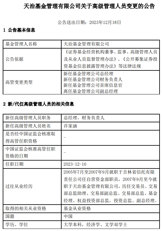 公告显示,许家涵2005年7月至2007年9月就职于吉林省信托有限责任公司任自营资金部职员,2007年9月至今就职于天治基金管理有限公司,历任交易员、交易部总监助理、交易部副总监、交易部总监、基金经理、权益投资部总监,投资总监、副总经理。