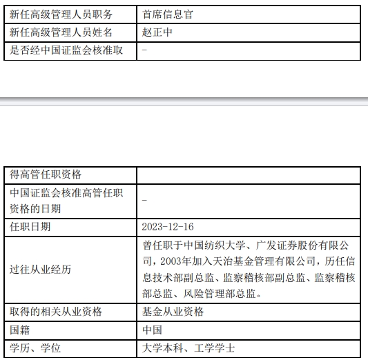 中国经济网北京12月18日讯 近日,天治基金管理有限公司发布关于高级管理人员变更的公告。公告称,许家涵任公司总经理、财务负责人,赵正中任公司首席信息官。