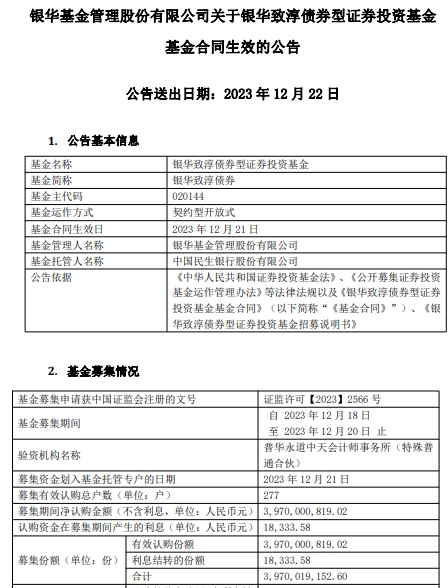 银华致淳债券成立 基金规模39.7亿元