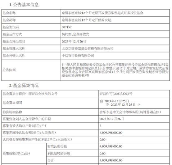 京管泰富京诚12个月定开债券发起成立 基金规模40亿元