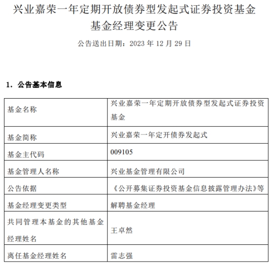 中国经济网北京12月29日讯 今日,兴业基金管理有限公司公告称,雷志强离任兴业嘉荣一年定开债券发起式(009105)。