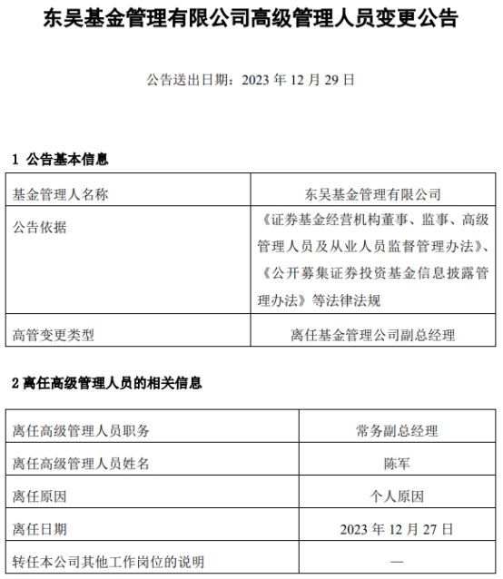 中国经济网北京12月29日讯 今日,东吴基金管理有限公司发布高级管理人员变更公告。公告称,公司常务副总经理陈军因个人原因于2023年12月27日离任。