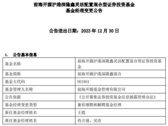 前海开源沪港深隆鑫混合增聘王霞 肖立强与吴彦离任