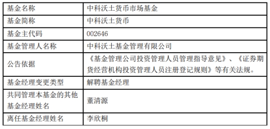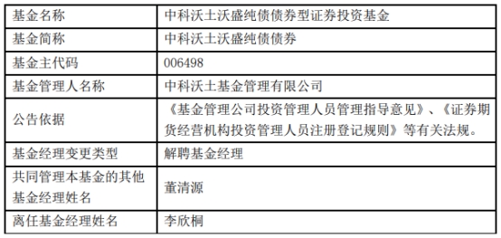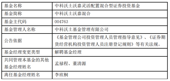 中科沃土基金李欣桐离任3只基金