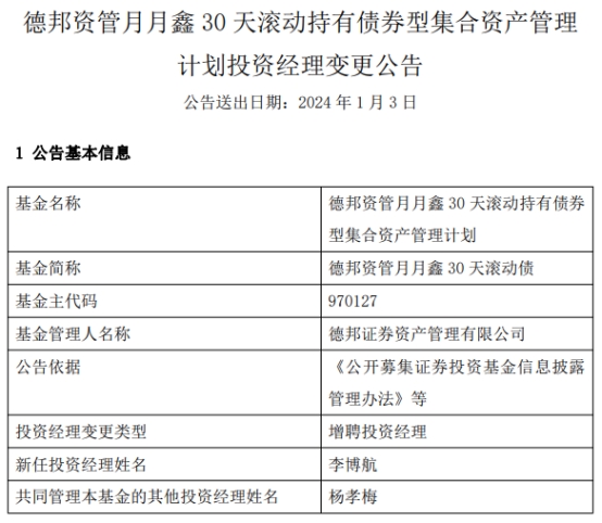 德邦资管月月鑫30天滚动债增聘投资经理李博航