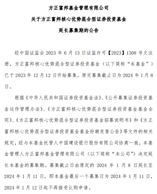 中国经济网北京1月8日讯 近日,方正富邦基金管理有限公司发布关于方正富邦核心优势混合型证券投资基金延长募集期的公告。公告称,方正富邦核心优势混合于2023年12月12日开始募集,原定募集截止日为2024年1月8日,现决定延长该基金的募集期至2024年1月11日。