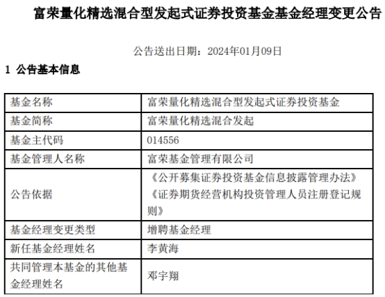 中国经济网北京1月9日讯 今日,富荣基金管理有限公司公告称,富荣量化精选混合发起(A类014556;C类014557)增聘基金经理李黄海。