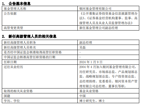 中国经济网北京1月9日讯 今日,银河基金管理有限公司发布关于高级管理人员变更公告,任命吴磊为副总经理。