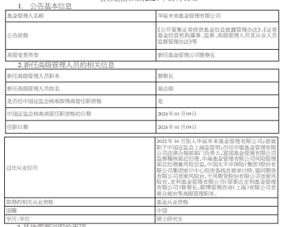 中国经济网北京1月10日讯 今日,华宸未来基金管理有限公司发布高级管理人员变更公告,任命聂志刚为督察长。