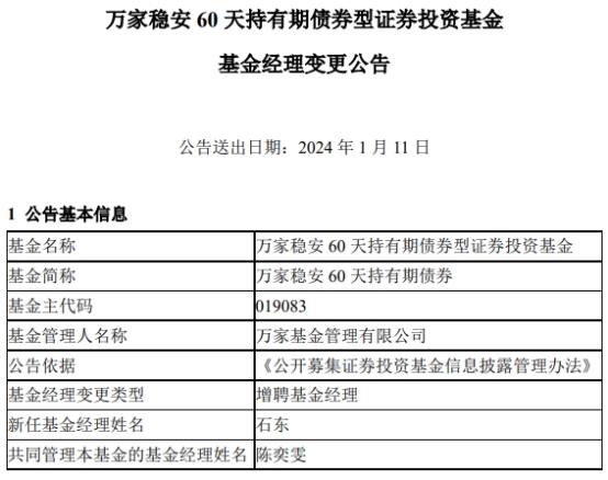 中国经济网北京1月11日讯 今日,万家基金管理有限公司公告称,万家稳安60天持有期债券(A类019083;C类019084)增聘基金经理石东。