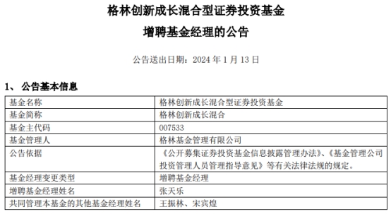 中国经济网北京1月15日讯 近日,格林基金管理有限公司公告称,格林创新成长混合(A类007533;C类007534)增聘基金经理张天乐。