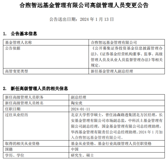中国经济网北京1月15日讯 近日,合煦智远基金管理有限公司发布高级管理人员变更公告。公告显示,陶安虎任公司副总经理。
