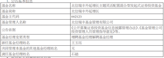 北信瑞丰外延增长增聘基金经理王玉珏 石础离任