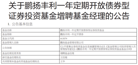 鹏扬丰利一年定开债券增聘基金经理王经瑞