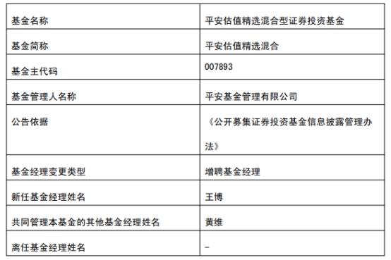 中国经济网北京1月18日讯 平安基金管理有限公司今日公告称,平安估值精选混合(A类007893;C类007894)增聘基金经理王博。
