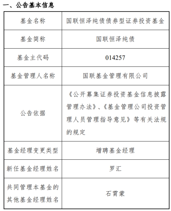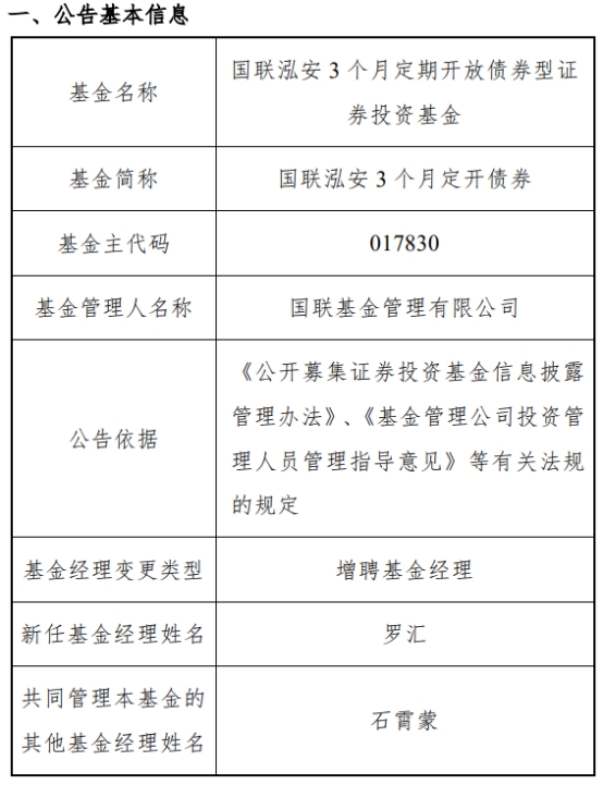 中国经济网北京1月19日讯 今日,国联基金管理有限公司公告称,国联泓安3个月定开债券(A类017830;C类017831)、国联恒泽纯债(A类014257;C类014258)增聘基金经理罗汇。