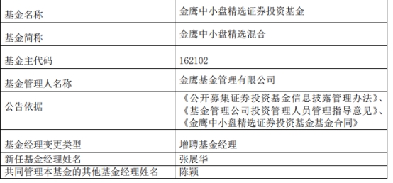 金鹰中小盘精选混合增聘基金经理张展华