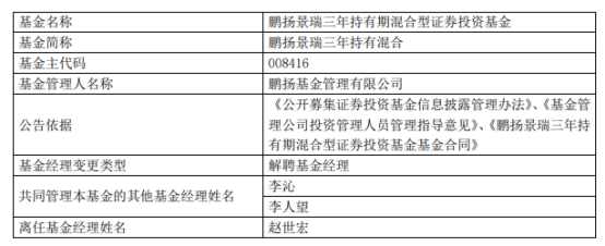 中国经济网北京1月19日讯 鹏扬基金管理有限公司今日公告称,基金经理赵世宏离任鹏扬景瑞三年持有混合(A类008416;C类008417)。