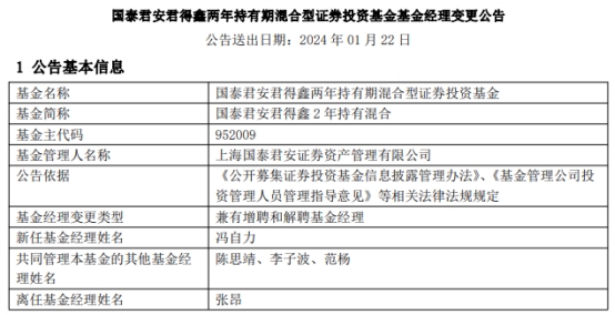国泰君安君得鑫2年持有混合增聘冯自力 张昂离任
