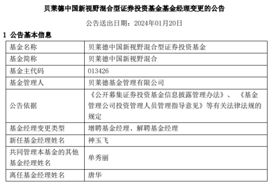 贝莱德中国新视野混合增聘基金经理神玉飞 唐华离任