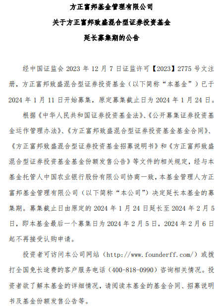 中国经济网北京1月22日讯 今日,方正富邦基金管理有限公司发布关于方正富邦致盛混合型证券投资基金延长募集期的公告。方正富邦致盛混合募集截止日由原定的2024年1月24日延长至2024年2月5日,2024年2月6日起不再接受认购申请。