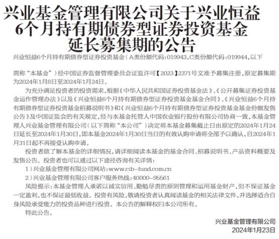 中国经济网北京1月23日讯 今日,兴业基金管理有限公司发布关于兴业恒益6个月持有期债券型证券投资基金延长募集期的公告。公告称,兴业恒益6个月持有期债券(A类份额代码:019943,C类份额代码:019944)原定募集期为2024年1月8日至2024年1月24日,现决定将该基金募集截止日延长至2024年1月30日。