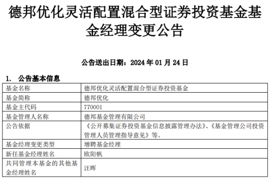 德邦优化灵活配置混合增聘基金经理欧阳帆
