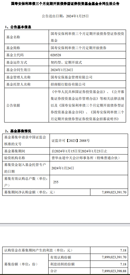 国寿安保利率债三个月定期开放债成立 基金规模79亿元