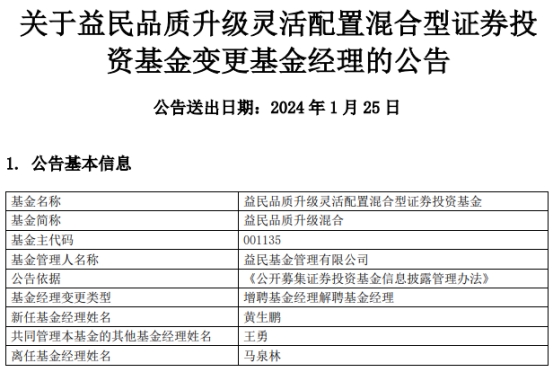 益民品质升级混合增聘基金经理黄生鹏 马泉林离任