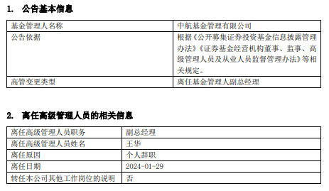 中国经济网北京1月31日讯 今日,中航基金管理有限公司发布关于高级管理人员变更的公告,副总经理王华辞职。