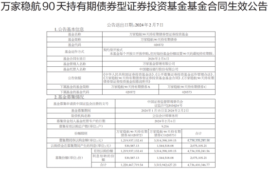 中国经济网北京2月7日讯 今日,万家基金管理有限公司发布万家稳航90天持有期债券型证券投资基金基金合同生效公告。