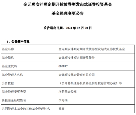 金元顺安沣顺定期开放债券增聘基金经理李海瑞
