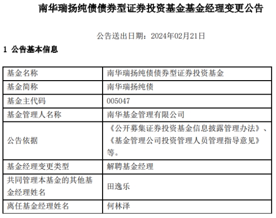 中国经济网北京2月21日讯 今日,南华基金管理有限公司公告称,何林泽离任南华瑞扬纯债(A类005047;C类005048)。