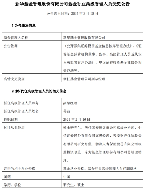 中国经济网北京2月28日讯 今日,新华基金管理股份有限公司发布基金行业高级管理人员变更公告。公告称,蒋茜任公司副总经理。